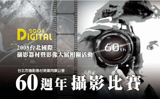 台北市攝影器材公會為慶祝六十大壽及三年一度攝影器材大展之開展,特於展前規劃攝影比賽,比賽共分為三大主題:節慶、風景、人,前兩大類限定拍攝地點限為台灣內,報名日期為即日起至9月20日,此次活動提供近百項之獎品,總價值近百萬,最高得獎者可獲得總價值高達近七萬的高額獎品組,包含相機、鏡頭、相關配件及腳架等豐厚組合,得獎者不僅獲得高額獎項,還可輸出作品於攝影器材大展中展示。